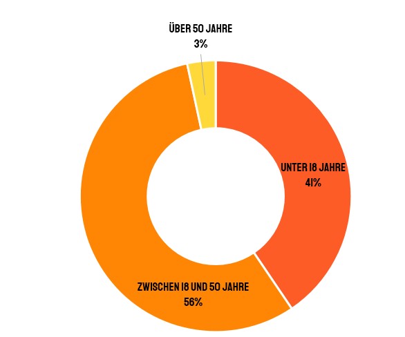 • Alters­struk­tur: 60 der 148 Betrof­fe­nen sind unter 18 Jahren, 83 sind zwischen 18 und 50 Jahre und 5 Betrof­fene sind älter als 50 Jahre.